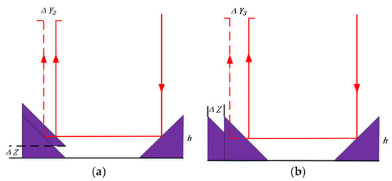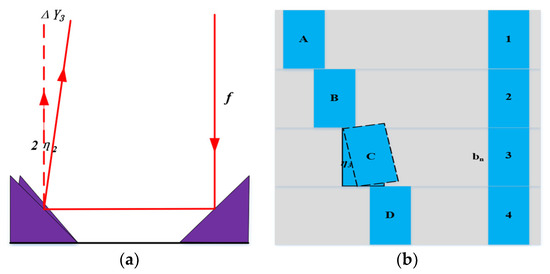 (a) Schematic diagram of the triangular reflector traverse error of the periscope array in the direction of the outgoing light; (b) Schematic diagram of the triangular reflector traverse error of the periscope array in the vertical direction of the outgoing light.
