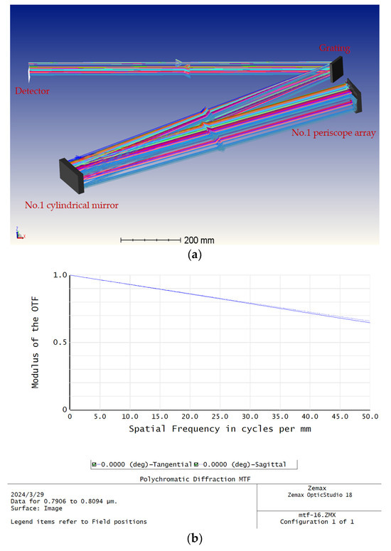 The technical parameters, such as in Table 1 and Table 2, are selected according to the above theoretical model, and the two-dimensional (2D) all-optical spatial mapping module is designed using ZEMAX software. A four-frame transverse module is constructed as shown in Figure 12a, and the MTF of the transverse module in sequence mode is shown in Figure 12b. It reaches 0.64 at 50 lp/mm, so the 50 lp/mm MTF of a two-dimensional module can be estimated to be above 0.3. The complete optical structure is shown in Figure 12c, and the spot distribution on the image plane of the complete optical structure is shown in Figure 12d. The design results show 1.25 nm spectral resolution and 16 wavelengths with the 4 × 4 frame arrangement on the detector. It should be explained that the unequal spacing of each frame is due to the non-linearity of grating dispersion. Fine tuning of the angle of the corresponding glass substrate of the periscope array allows for an approximate equidistant arrangement, as shown in Figure 12e.