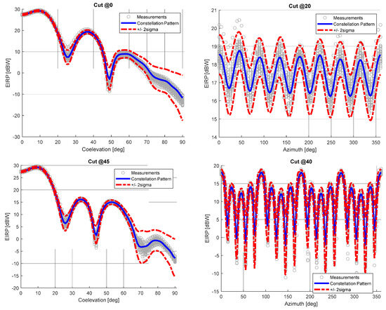 Galileo E1 Constellation pattern at different co-elevation and azimuth cuts (blue line) together with confidence bounds (red dotted line) vs measurement data (grey samples).
