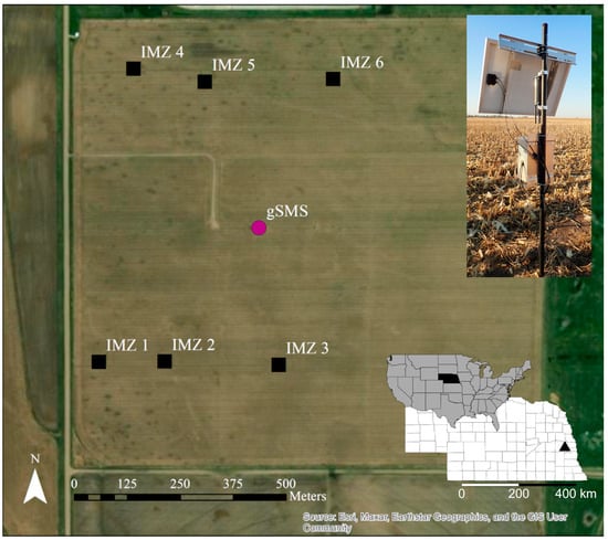 In this study, we tested the gSMS at an agricultural field within the Eastern Nebraska Research and Extension Center near Mead, Nebraska, United States. The US-Ne3 site is within the United States Department of Agriculture Long-term Agroecosystem Research (LTAR) Network as well as the Ameriflux network. US-Ne3 is a no-till, rainfed site with a maize–soybean rotation. Length of the frost-free growing season is approximately 161 days and the majority of precipitation falls during the April to September growing season []. The mean annual precipitation is 760 mm and the mean annual temperature is 10 °C. The highest average monthly temperature (31 °C) occurs in July and the lowest (−9 °C) occurs in February []. The soils are mollisol silt loams and silty clay loams (average texture of 30.1% clay, 58.7% silt, and 11.2% sand for 0–30 cm depth).