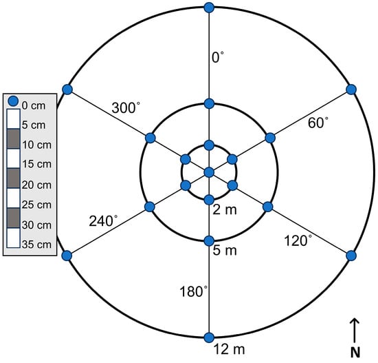 Gravimetric water content was measured with a sample pattern designed to characterize the estimated gSMS sensing volume in the horizontal and vertical directions, assuming 95% of the gamma-ray signal originates within 24 m horizontally and 35 cm vertically. Samples were collected every 60° at radii 0, 2, 5, and 12 m away from the gSMS for a total of 133 samples for each campaign (Figure 2). In the vertical direction, seven total samples were collected every 5 cm down to a maximum depth of 35 cm below the surface. Sample tins were then returned to the lab, weighed, and dried at 105 °C for 48 h to determine the ratio of mass of water () to mass of dry soil () in g g−1. Gravimetric water content, , is defined as: