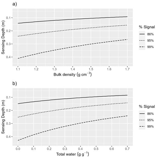 (a) Total water content is 0.27 g g−1 and the sensing depth for 86% (2 e-folding depth), 95% (3 e-folding depth), and 99% of the detected signal is plotted for a range of bulk densities using Equation (8). (b) Bulk density is 1.37 g cm−3 and the sensing depth for 86% (2 e-folding depth), 95% (3 e-folding depth), and 99% of the detected signal is plotted for a range of total water values using Equation (8).