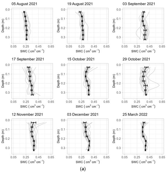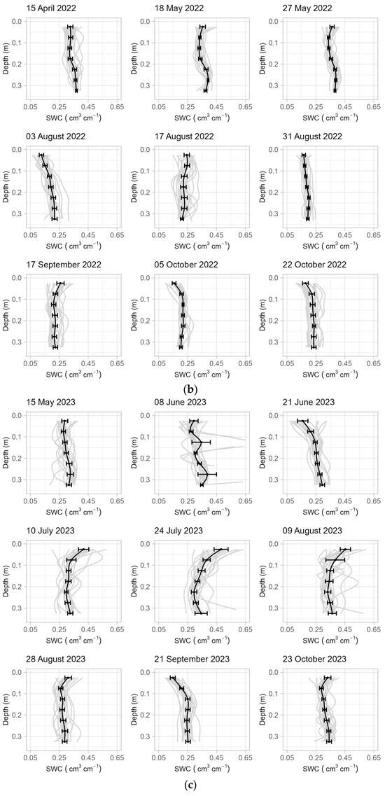 (a) Soil moisture profiles from the September 2021 to March 2022 sampling campaigns. The samples from the 7 depths at each location were interpolated to plot the 19 profiles for each sampling day in gray. For each sampling day, the samples were also averaged by depth (black points) and interpolated to find the average profile (black line), with horizontal error bars showing two standard errors. (b) Soil moisture profiles for the April to October 2022 sampling campaigns. (c) Soil moisture profiles for May to October 2023 sampling campaigns.