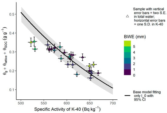The experimental relationship between total water—the sum of gravimetric water content (), lattice water (, and soil organic carbon ()—and 40K specific activity compared to the relationship predicted by the first calibration equation without the biomass correction (black line), with the corresponding 95% confidence interval (gray band).