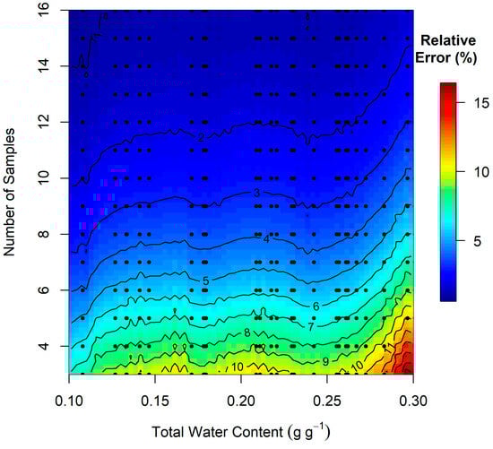 Relative error in total water content () calculated from the number of sample profiles indicated on the vertical axis compared to calculated using all 19 sample profiles. The image was generated by smoothing the sample relative error values shown by the black dots to a regularly spaced grid and then interpolating via inverse distance weighting.