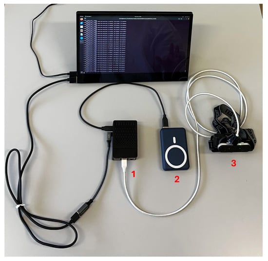 System embodiment: (1) the RSP enclosed in its case, (2) the power bank, (3) the LMC inside the head-mounted support. The presence of the monitor, not used in the final embodiment, is necessary during system calibration to set the values of the parameters.