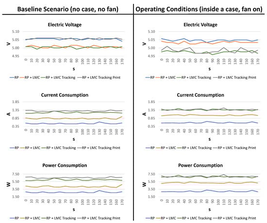 Starting from the RSP without the case (baseline scenario), the electric voltage was almost the same across all tasks, ranging between 4.99 V and 5.06 V.