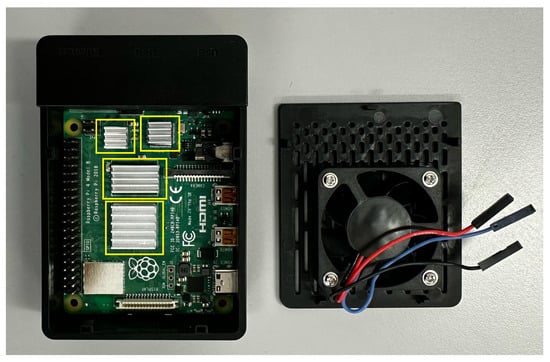 Starting from the baseline scenario, the CPU usage was minimal in the RSP configuration (the GUI was disabled). When the LeapD was running (RSP + LMC), CPU usage was almost 11%, and it reached 74.02% when data were requested from an application (RSP + LMC + Data). When printing was added (RSP + LMC + Data + Print), the average CPU usage increased slightly. Regarding the temperature, in the RSP configuration, it was 53.66 °C and increased for each task: 60.36 °C, 74.75 °C, and 75.49 °C. This demonstrates that without any active cooling, the temperatures reached were too high. In fact, during the most intense task (RSP + LMC + Data + Print), there was a peak temperature of 80.34 °C. As reported in the specifications, the RSP began to throttle the processor when the temperature reached 80 °C, increasing when it reached the maximum temperature of 85 °C [43]. This justifies the adoption of a fan installed on a case. In fact, in the proposed configuration, even though the CPU usage was almost identical to the baseline scenario, the drop in temperature was evident across all tasks. Even in the most intense task, the maximum temperature registered was 58.43 °C, which was almost 22 °C lower than in the same task without the fan, although it is now enclosed in a case. Additionally, in both scenarios, passive adhesive aluminum heatsinks were used, as shown in Figure 7.