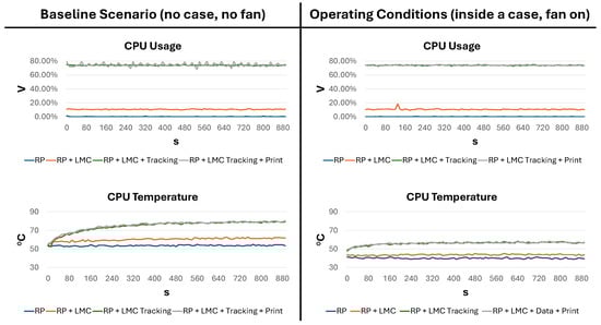Finally, the plots for the baseline scenario and the operating configuration are shown in Figure 8. Although CPU usage was stable, the CPU temperature significantly increased, especially in the baseline scenario. In fact, in the RSP + LMC + Tracking + Print configuration, the temperature exceeded 70 °C after only 160 s and was unstable, showing an increasing trend. In contrast, in the same scenario for the final RSP assembly, after the same amount of time, the temperature had already converged to a stable value at around 58 °C.