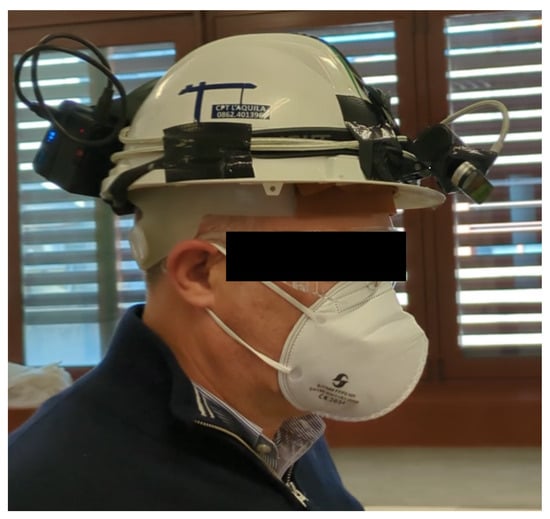We used the proposed system in the configuration shown in Figure 9, where the system was mounted on a helmet to improve safety at work (as can be seen, the RSP and the power bank were also fixed on the back part of the helmet). In addition, forearm tracking could be used to check for dangerous forearm positions regarding a mechanic tool and proactively stop the tool in the case of risks.