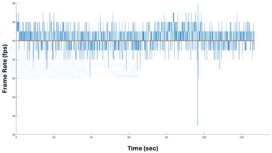 We tested the proposed system while the forearms were performing different tasks: simple movements in the air (the person was standing up), typing on a keyboard (the person was sitting), and interacting with a manual tool (the person was walking around the room while performing tool tapping). For the latter task, the illumination conditions varied due to the fact the person was moving near a window, then in the center of the room, and finally, near the illumination of a lamp. This is an important aspect because the LMC is based on the use of infrared light to operate: external sources of infrared light could negatively affect tracking precision. Furthermore, in this situation, the software activates specific countermeasures to compensate for this, requiring considerable CPU overload [46]. However, in our test, the results of which are reported in Figure 10, the proposed system was capable of operating at an average of 64 fps, with values ranging between 62 fps and 66 fps. Only in one isolated case did it drop to 55 fps, corresponding to a fast passage close to the window. Ultimately, the system always operated above 30 fps, thus ensuring real-time tracking.