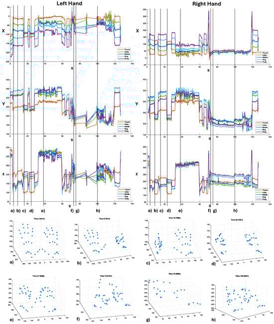 The plots of the spatial positions of each fingertip of both hands as measured by the LMC. To improve visualization, measurements for each spatial coordinate are shown in separate plots. For each coordinate, measurements of the fingertips from the same hand are shown in the same plot with different colors to facilitate comparison. The vertical dotted lines represent particular hand poses (shown in the scatter plots from (a–h) to better contextualize the plots.