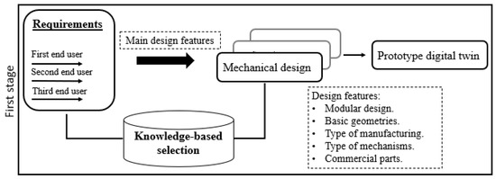 Figure 1 shows the first stage of the proposed methodology: where the main design features are obtained from the requirements (indicated above). Its selection is based on knowledge of the real-world problem, the result of this stage is the virtual digital twin prototype (DTP) of the exoskeleton. An advantage of DTP is that it can perform engineering design evaluations, kinematics, dynamics and control. Furthermore, it can be optimized under various criteria such as weight, service life, bending and efficiency. This work focuses on optimizing the weight of a safe mechanical design and this is described below.