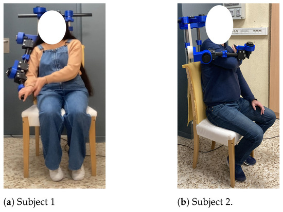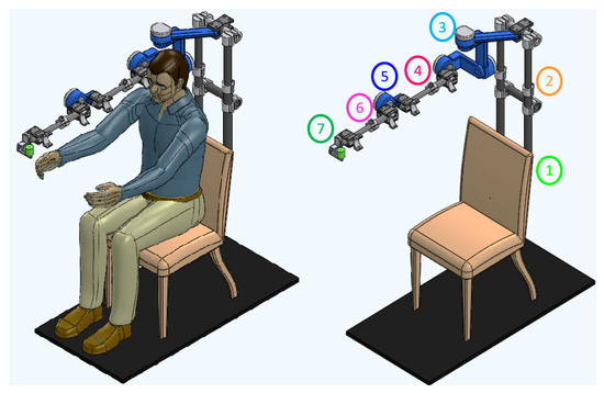 - Shoulder height adjustment: The specialist manually adjusts the exoskeleton to the height of the patient’s shoulder, the length of which can vary between 0.10 and 0.30 m (see number 2 in Figure 2).