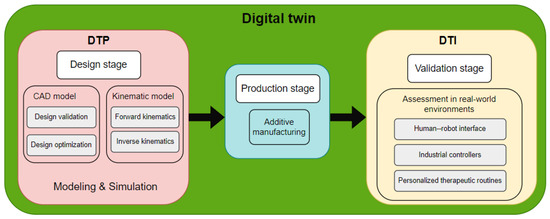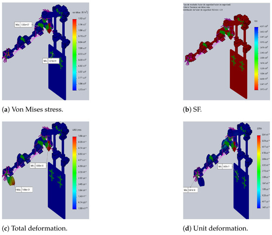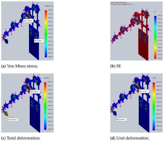 The generation and use of a DT make it possible to create sustainable work environments (they establish human–robot interaction in the modeling and simulation of the device), to evaluate the virtual prototype before manufacturing the physical device (reducing costs and manufacturing time) [34,44,45]. They also offer a variety of options to ensure collaborative security in industrial environments. These can be divided into validation, analysis, prediction and improvement [46]. In this study, a design validation approach is employed, utilizing finite element analysis to verify the mechanical feasibility of the device. It is important to emphasize that the device’s SF must always exceed one to ensure that the maximum stress of the material does not surpass its yield stress, thereby preventing the fracture of the parts. Thus, the proposed methodology can be adapted and implemented in different areas of product development due to its metaheuristic approach.