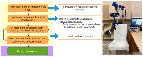 During physical rehabilitation treatments, practical and biomechanically effective devices are required to enable manual activities. Therefore, to increase their adoptability, usability and safety, various methodologies have been implemented to develop exoskeletons, highlighting those based on bio-inspired models and real scenarios [12,13,14]. For these reasons, developing an exoskeleton is a multidisciplinary challenge that requires the collaboration of patients, medical specialists and exoskeleton developers.