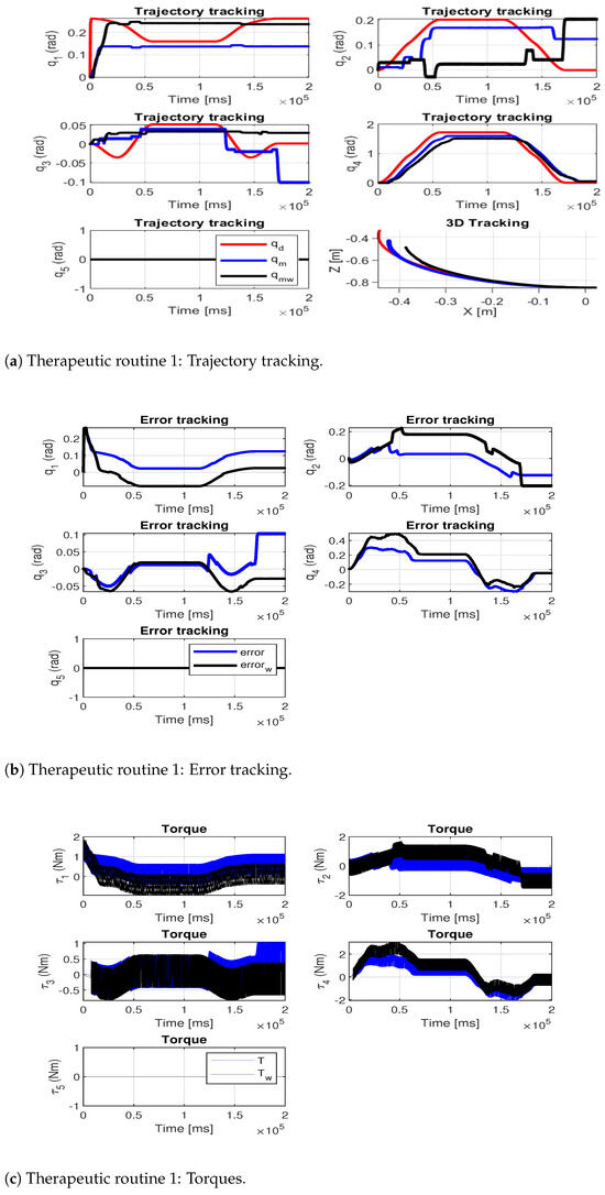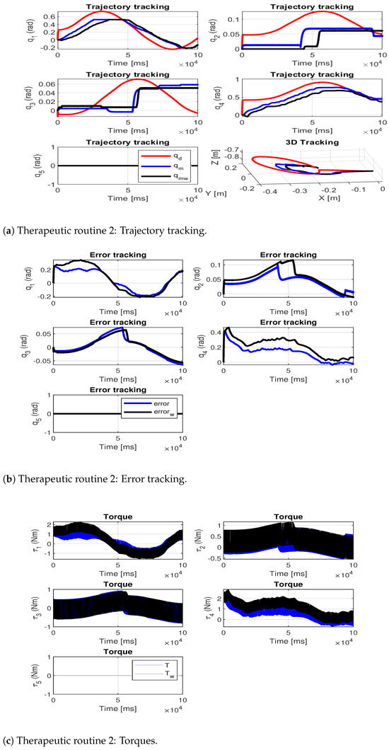 The following therapeutic routines were implemented: the first performs a simple movement (elbow flexion–extension from 0° to ) and the second a combined movement (circumduction movement). Figure 9a and Figure 10a show the trajectory tracking for the therapeutic routines: the desired trajectory is shown in red, the measured path of the exoskeleton without load is shown in blue and the measured path of the exoskeleton with the additional load is shown in black. Figure 9b and Figure 10b show the tracking error at each joint and Figure 9c and Figure 10c show the joint torques during the execution of the movements.