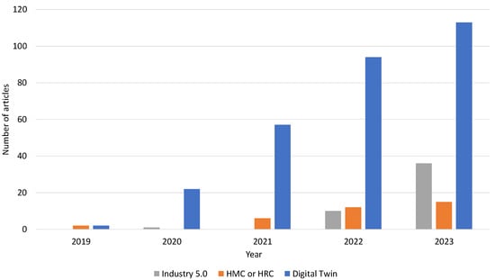 Based on the title search in the Web of Science (WoS) database for review categorisation, the numbers of review and survey papers on themes such as Industry 5.0, HMC or HRC, or DT, we can see that the trend of these concepts has increased rapidly in the last 5 years Figure 1. However, in the case of DT, most of the review and survey papers are scarcely or not at all focused on human factors. For this review, to evaluate previous review papers, we decided to select and focus only on those articles that were focused on humans in more depth, which resulted in a comparison of 20 review and survey papers that were found in the WoS database for the keyword- and title-based search as follows: