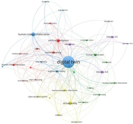 The found keywords in Table 2 and their total link strength show that HRC is the biggest topic related to humans and DT, while the term “human–machine collaboration” is not used extensively in the literature. The technologies with the biggest total link strength include virtual reality and artificial intelligence, indicating their biggest literature coverage in implementing DTs in HMC applications.