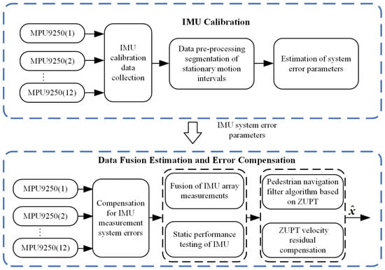 This paper aims to improve the navigation performance of the system by calibrating and compensating for the velocity residual of a custom-designed IMU array. Traditional multi-position IMU calibration methods have not paid much attention to the accurate segmentation of stationary and moving intervals. However, the accuracy of segmentation directly affects the calibration accuracy of IMUs. To address this, we designed a sliding variance detector for angular velocity magnitude to improve the segmentation accuracy and hence the calibration accuracy of IMUs. In addition, velocity residual position errors after ZUPT, which are often overlooked in pedestrian navigation research, can accumulate over time. We treat the displacement in zero speed intervals as pseudo measurements and compensate for position errors caused by velocity residual. The general framework of this process is illustrated in Figure 1. First, each IMU in the array undergoes individual calibration to estimate systematic error parameters, thereby compensating for the systematic errors of the IMU array. Second, the measurements from the IMU array are fused, and the static noise performance is evaluated. In addition, a ZUPT algorithm is applied to correct pedestrian navigation and to compensate for position errors due to residual velocity after ZUPT. Finally, the pedestrian navigation performance is evaluated. The proposed method improves IMU array data fusion and pedestrian navigation accuracy by integrating IMU calibration and velocity residual compensation. This advancement enables the IMU array to produce more accurate measurement results, thereby improving the overall accuracy performance of pedestrian navigation. Consequently, this research is crucial for the implementation of IMU arrays in pedestrian navigation and provides valuable references for future related studies.