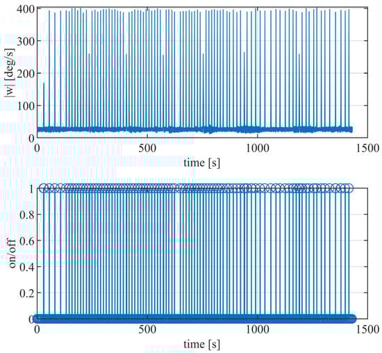 The collected data are pre-processed and segmented into stationary and moving intervals. Figure 4 illustrates this process, with the upper part representing the magnitude of the angular velocity. In contrast, the lower part shows the corresponding stationary and motion intervals, with empty intervals representing stationary periods and blue intervals representing motion periods. A total of 89 rotations were carried out, resulting in 89 motion intervals that correspond to the actual motion situations. This paper applied fine-tuning to the end points of the fixed intervals to ensure the accuracy of the segmentation points between the stationary and motion intervals. The accuracy of the segmentation points was determined based on the calibration results of the accelerometer. Multiple experimental validations confirmed that the accelerometer calibration achieved higher accuracy at the average segmentation points. These results indicate that by analyzing the angular velocity magnitude, the stationary and motion intervals can be accurately distinguished without missed detections, thereby ensuring the accuracy of the IMU array calibration.