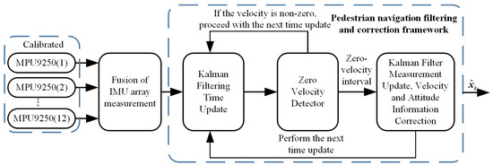 However, consumer-grade MEMSs suffer from design and manufacturing flaws that lead to significant measurement errors in their output values. These errors accumulate over time during pedestrian navigation, severely affecting the accuracy of the system [16]. Correcting and compensating for these errors is necessary to achieve higher accuracy in pedestrian navigation. Methods for correcting and compensating for IMU measurement errors include calibrating the IMU and then fusing the measurements from multiple IMUs to form an IMU array [17]. According to the theory of random error, fusing data from N IMUs can reduce the random error by a factor of compared to a single IMU and achieve higher measurement accuracy [18]. Therefore, constructing an IMU array by combining multiple IMUs can significantly improve measurement accuracy, while the redundancy of MEMS further enhances measurement reliability.