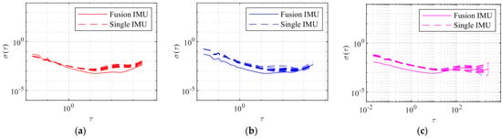 Due to the lack of temperature error compensation in this paper, the theoretical noise performance of the custom-developed IMU array is compared to the commercially available MTi-2 and ADIS16500 IMUs. The MTi-2 sensor is manufactured by Xsens, a subsidiary of Movella based in the United States. The ADIS16500 sensor is manufactured by Analog Devices, Inc. located in Massachusetts, United States. Based on the performance parameters provided by the manufacturers, comparisons are made in terms of the noise performance of the accelerometers and gyroscopes, as well as the price of the IMUs. The comparison results at 25 °C are shown in Table 1 and indicate that the custom IMU array reduces the cost by 64.60% and 65.22% compared to the other two IMUs. The theoretical noise density of the custom IMU array for gyroscopes is lower than the other two IMUs and close to that of the MTi-2, with a reduction of 52.46% compared to the ADIS16500. The accelerometer noise density is similar to the other two IMUs. Based on the comparison, it can be concluded that the low-cost array designed in this paper significantly reduces the cost compared to the mainstream IMU modules on the market, while its performance is also comparable to the compared IMU modules.