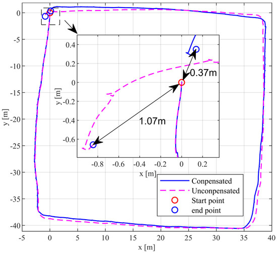 Experimental results indicate a significant improvement in the average noise performance of the calibrated IMU array, which improves by 3.01 times in terms of static noise. In the closed-loop walking experiment, horizontal position errors decrease by 64.52% after compensating for the velocity residual. Compared to individual IMUs, the calibrated IMU array performs 2.98 times better. Moreover, the calibrated array outperforms the un-calibrated IMU array with a 50.49% reduction in horizontal position errors. The experiment also demonstrates that static and dynamic performances align closely with the theoretically expected results. In summary, the error compensation method proposed in this paper has achieved favorable navigation performance on the self-developed IMU array. Therefore, similar error calibration and compensation methods can be adopted by other IMU array systems to achieve improved navigation performance.