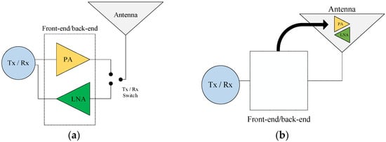 In current knowledge, the front-end/back-end is designed separately from the antenna and packaged in the form of an integrated circuit, whose input/output (I/O) impedances are set close to 50 Ω (impedance antenna). Other chips’ impedances are not 50 Ω, requiring an external impedance-matching circuit. The advantage of this basic approach (Figure 1a) is that it gives rise to an almost ready-to-use front-end/back-end, whatever the characteristics of the antenna. However, this approach completely ignores the benefits of the electromagnetic behavior of the antenna.