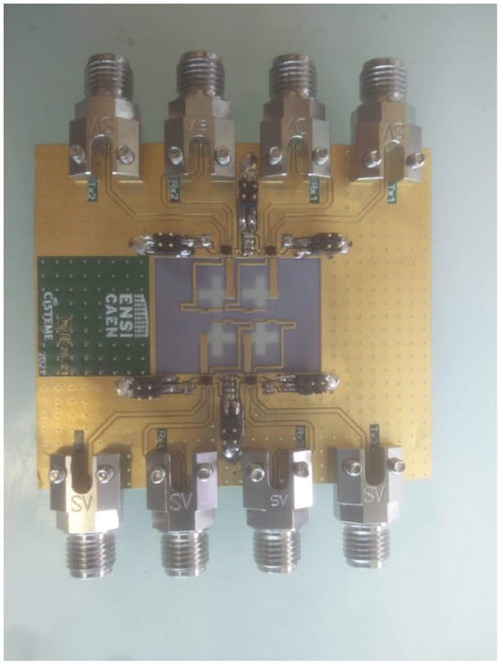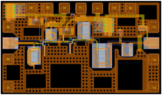 The fully integrated mm-wave LNA for 5G applications was fabricated in 0.25 μm SiGe BiCMOS technology. The chip layout is shown in Figure 15, and it occupies an area of 702 × 1220 µm2.