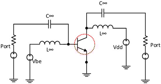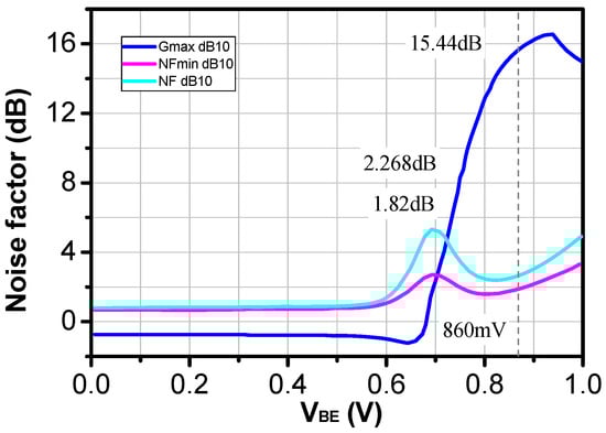 Transistor size is the first important step in designing an active integrated circuit [14]. The main design specifications of the proposed LNA include a gain of 30 dB and an NF below 2.5 dB in the frequency band between 26 GHz and 28 GHz, which fits 5G antenna transceivers. Simulating the DC and RF characteristics of the transistor devices is the first step to verify the feasibility of a low-noise amplifier. For example, the DC characteristics, NF, NFmin, and gain as a function of the base-emitter voltage of the transistor (Vbe) are presented in Figure 3. We chose a 0.25 μm BiCMOS SiGe process with an fT/fMAX ratio of around 180/200 GHz.