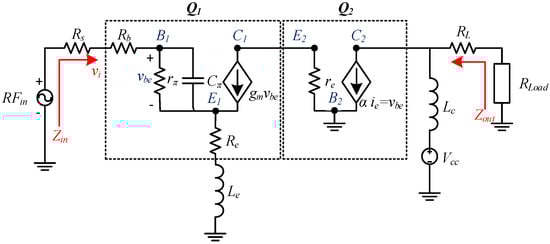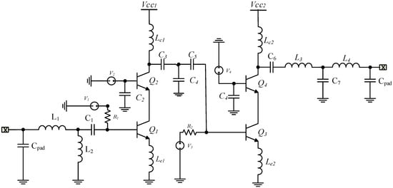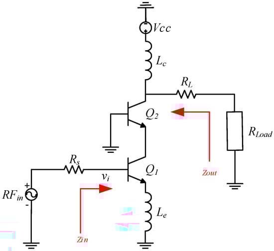 Since a single-stage design is inefficient in achieving the required design trade-offs in the mm-wave band, most LNA circuits include multiple stages [7,8], like the cascode topology [9,10,11,12,13]. With the common-base transistor, this design has better stability and reverse isolation, as well as improved bandwidth and high gain over the entire mm-wave frequency band. In addition, the cascode topology’s output admittance is quite low compared with the common-emitter topology, based on its low capacitive component [8].