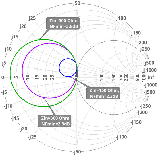With an adequately degenerated inductance, Figure 9 shows the position relationship between the circle of NF and the input impedance Zin at 27 GHz. Even though 50 Ω is the reference value, 150 Ω is the real value.