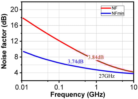As presented in Figure 11, NF and NFmin are plotted as a function of frequency. The obtained NF at 27 GHz was 3.84 dB, while NFmin was 3.74 dB.