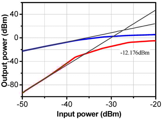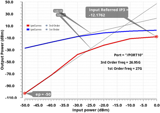 The third-order intercept point IIP3 of the proposed LNA was −12.17 dBm, as illustrated in Figure 14. The lines in blue and red are the fundamental output power and the third order intermodulation distortion products power (IMD3 or IM3), respectively.