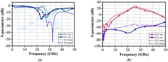 The simulated and measured S-parameters of the LNA presented in Figure 17a,b are in good agreement. As can be seen, the LNA achieved a maximum gain of 26 dB at 27 GHz and a gain greater than 25 dB over the 26–28 GHz frequency range. In addition, isolation S12 was less than −32 dB over the same frequency range.