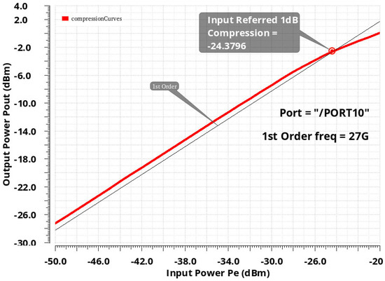 The developed LNA showed close gain and similar NF values to other circuits. Moreover, this work stands out by having the highest gain per stage, which is essential for low power consumption. The linearity of the LNA was simulated from the extraction of the compression point P1 dB and the point of intermodulation of order 3, IIP3. The simulations of the P1 dB and IIP3 at 27 GHz are provided in Figure 19 and Figure 20, respectively.