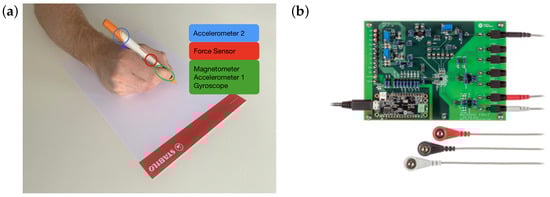 (a) STABILO Digipen sensor locations, Copyright by STABILO International GmbH [49]. (b) MAX3001 EV kit and electrodes, Copyright by Analog Devices [50]. Used with permission.