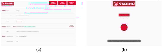 (a) DigiPen’s Demo Kit application home page. The ”Connect“ button enables Bluetooth. (b) Interface when the data are being recorded from all sensors while writing.