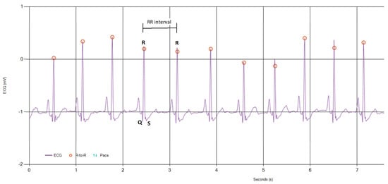 The R-waves correspond to the heart beat. Figure 3 clearly shows the first positive deflection of the QRS complex, which is the ventricular depolarization [52]. Indeed, the R-wave is the highest peak because it is the ventricles’ main mass that depolarizes [51]. Hence, by measuring the time interval between two consecutive R-waves (i.e., the RR interval) one can directly compute the heart rate as [53]
