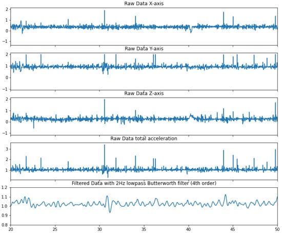 Signal processing of the accelerometer data, plotted on a 30 s period for a more detailed view.