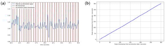 (a) DigiPen’s accelerometer signal after filtering with dotted vertical lines indicating the peaks’ timestamps from the accelerometer (-) and the RR interval (-) from the ECG. It is plotted over a 20 s period for a more detailed view. (b) Correlation between the peaks’ timestamps.