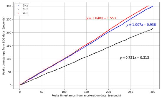 Correlation comparison between the peaks’ timestamps for cut-off frequency low-pass filters 1 Hz(•), 2 Hz(•), 4 Hz(•), with corresponding linear regression equations.