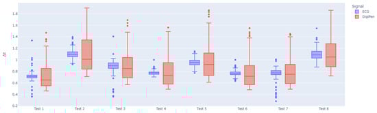 As previously mentionned, for our data analysis, we studied two sets of vectors in the distributions: t-vectors and -vectors. As seen in Table 1, the t-vectors are practically the same. Both the Pearson correlation coefficients and the cosine similarity factors were computed and suggested over 99% correlation. Meanwhile, the derived average time difference from the DigiPen data accurately correlates with the reference ECG data. Obviously, since the pen is not as precise as the ECG, the standard deviation for the DigiPen’s results is always larger. However, this does not affect the similarity between the heart rate values. The most considerable deviation recorded is only 0.76 bpm, which is negligible for clinical purposes, since the heart rate is usually expressed to the nearest unit. Welch’s t-test was computed between the -vectors to assure that the observed difference between the sample means of the two vectors is statistically significant or if it could have occurred due to random sampling variability. Since all p-values are above 0.05, this suggests there is no statistically significant difference. Welch’s t-test was chosen because the distributions’ variances were unequal, but the sample sizes were large ().