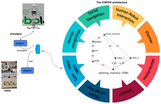 The CORTEX cognitive architecture is a highly dynamic framework that has evolved continuously since its inception in 2016 [,]. In its present iteration, CORTEX is designed as a distributed architecture centered around a working memory (WM) and a set of agents with access to it. The working memory is formally represented as a directed graph where vertices hold metric or symbolic data, and edges signify geometric or logical predicates. The nodes or vertices represent concepts within the ontology, and the edges denote relationships between them. Functioning as a working memory, deep state representation (DSR) aims to depict the current situation involving the robot’s body, intentions, and the surrounding space and objects relevant to the ongoing task. The agents play a crucial role in creating and maintaining this representation, implementing functionalities such as perception and motor modules, along with procedural, declarative, and episodic memories in alignment with the standard model [].