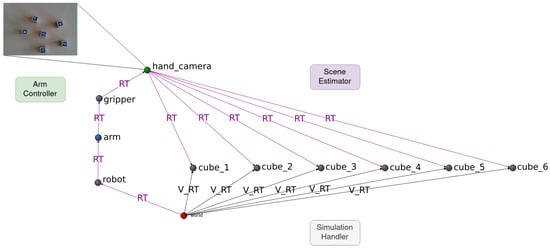 Example DSR state. Arm controller writes camera readings as an attribute of the hand_camera node (top). Position estimations of the cubes (middle) are presented as RT edges from hand_camera, inserted by the scene-estimator agent. Virtual_RT edges (named V_RT in this figure) represent geometric transformations from the origin (world node, bottom) to every cube and are given by the simulation-handler agent.
