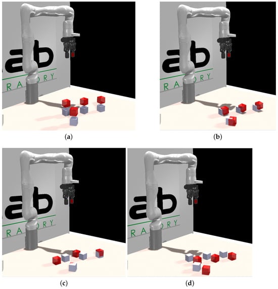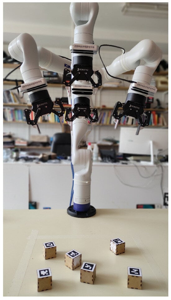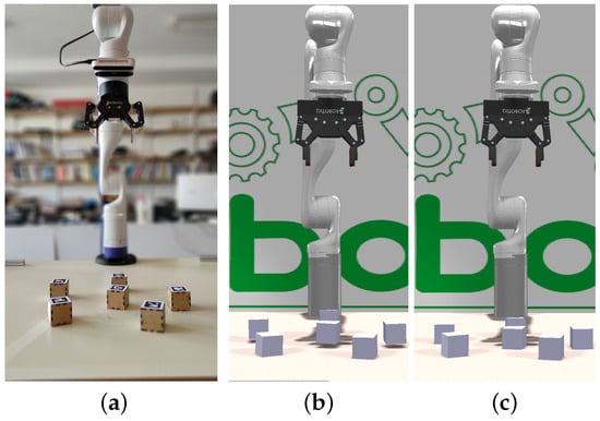 The experimental setup comprised a Kinova Gen3 (Boisbriand, QC, Canada) (or Open Manipulator Pro developed by Robotis (Chiyoda, Tokyo)) robotic arm positioned on a table and a set of 4 cm × 4 cm cubes, each marked with a distinct AprilTag [] on one face. Attached to the wrist of the robotic arm was an RGBD camera (Realsense D415 (Intel RealSense, Santa Clara, CA, USA)). The simulation was conducted using CoppeliaSim V4.4 (Zurich, Switzerland) [].