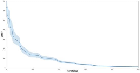 Using a setup with four cubes and a top view, 50 trials of this experiment were executed. Figure 5 illustrates the evolution of the error during the optimization process. This graph demonstrates that the method can attain low error values for even when commencing from highly erroneous initial guesses. While convergence does not guarantee that is the actual pose, the results indicate a low variance across trials, and the estimated position of the camera is close to the measured position (Figure 6).