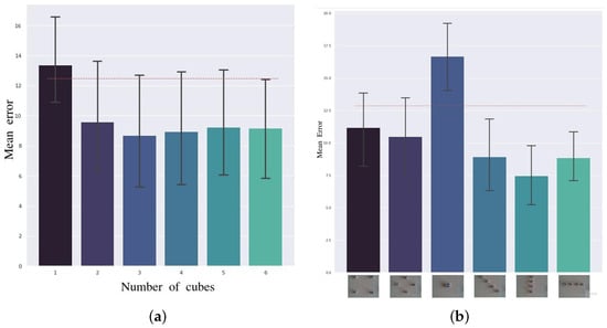 For this experiment, the system was calibrated by varying the number of cubes. For each quantity, three calibration sessions were performed. The combined results of these are presented in Figure 8a. The dashed red line represents the error made by the system using the initial, i.e., precalibration, transformation.
