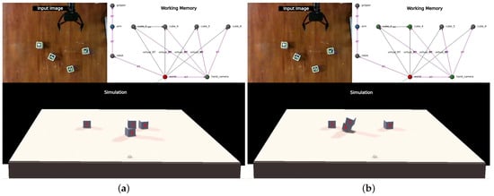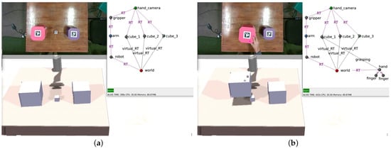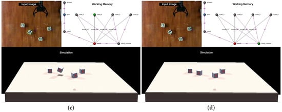 To assess this functionality, a straightforward scene was constructed, akin to the one depicted in Figure 3. Once the cubes were detected and integrated into the simulation, the last transformation in the kinematic chain to the camera () was intentionally distorted. Specifically, the spatial transformation from the arm’s tip to the camera was replaced with a random one. This manipulation achieved the desired effect, where all cubes remained visible, but the disparity between detected () and remembered () positions was larger than expected.
